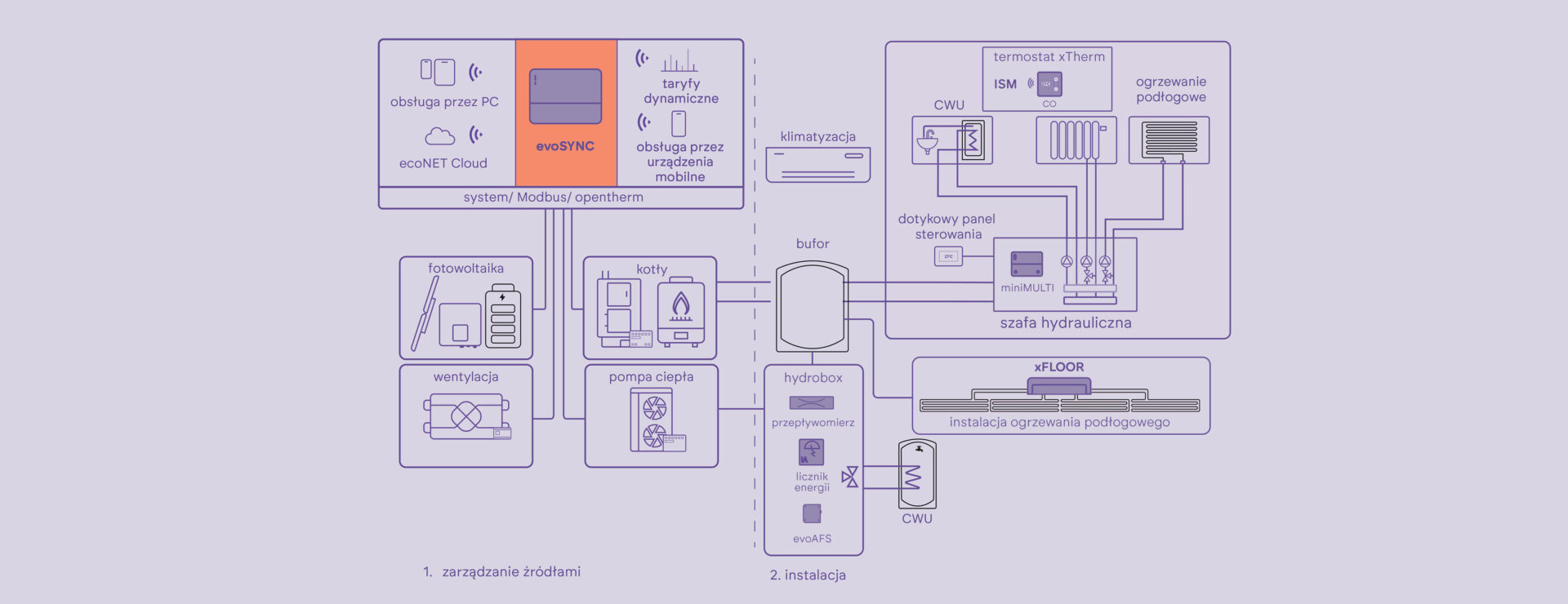 evoSYNC to inteligentny moduł zarządzający, który dynamicznie dostosowuje działanie urządzeń, aby maksymalizować oszczędności i wydajność pracy systemu, wykorzystując dane o aktualnych cenach energii, temperaturę zewnętrzną oraz parametry pracy urządzeń.